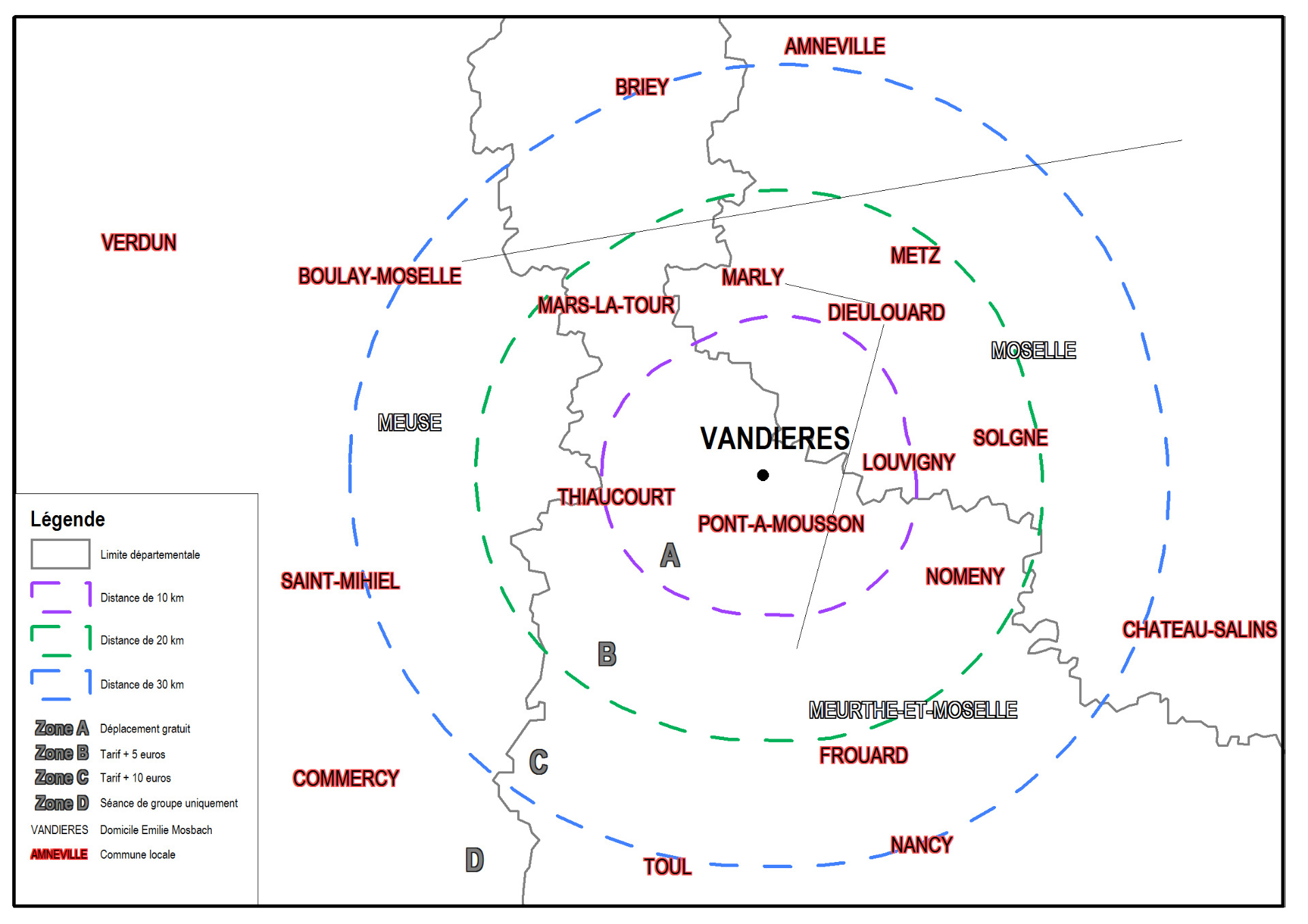 En fonction de votre lieu de domicile ou de travail, j'applique un tarif supplémentaire de 5 à 10 euros (cf. carte ci-jointe). Au-delà de 30 kilomètres, je me déplace uniquement pour les groupes de 6 personnes sur devis.